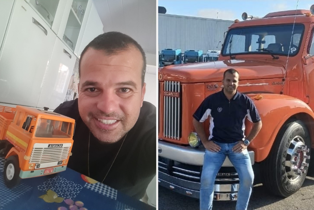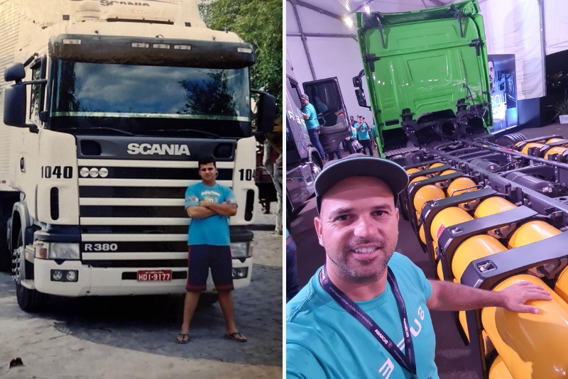 À dir., sonho realizado ao dirigir o Scania R 380; à esq., alguns anos depois, outra conquista: William