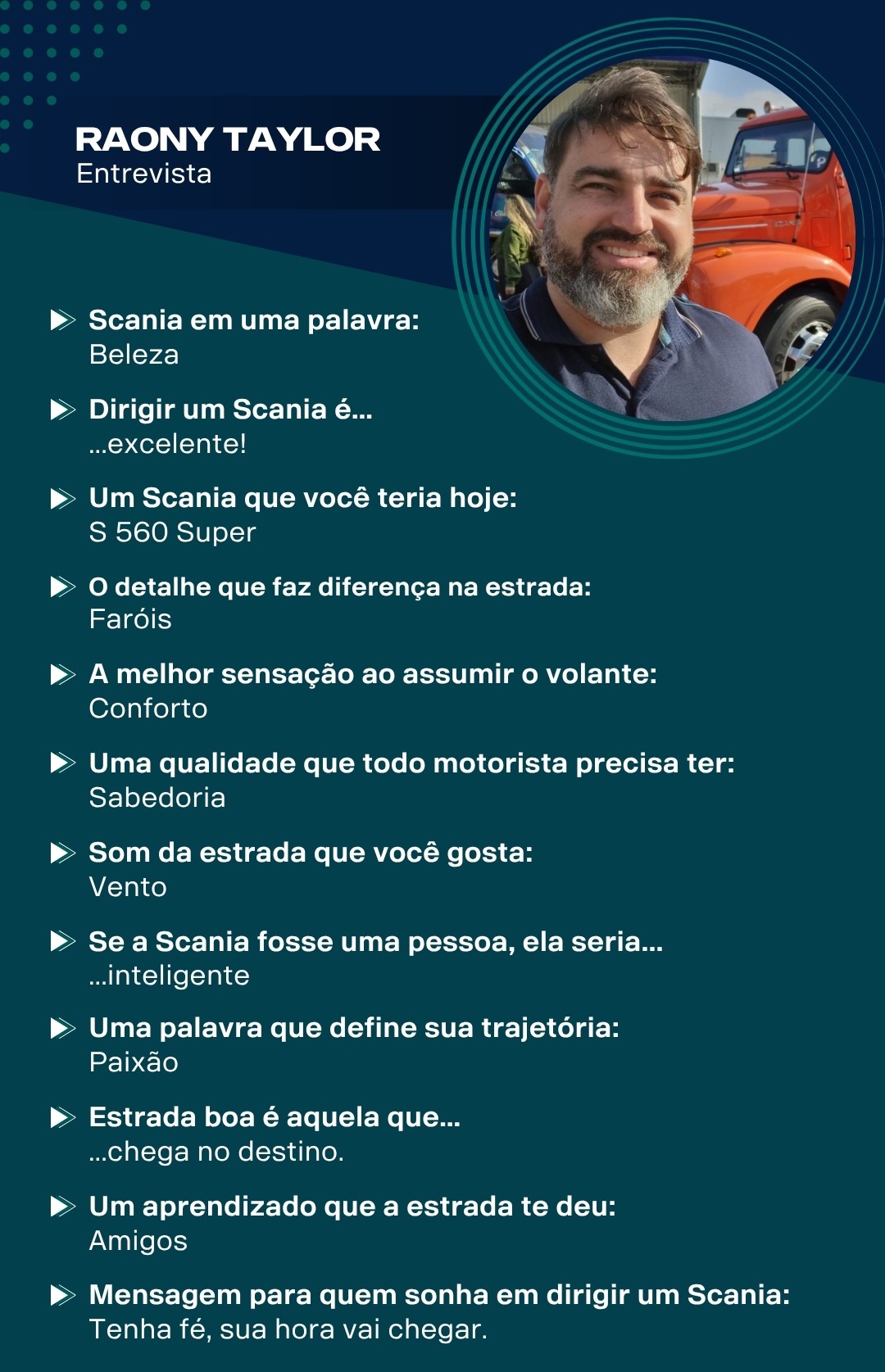 Motorista e empresário, Raony Taylor, sonhava desde criança em ter Scania, participou do concurso Melhor Motorista de Caminhão do Brasil (MMCB) e comprovou que os caminhões da marca vão além da imponência nas estradas